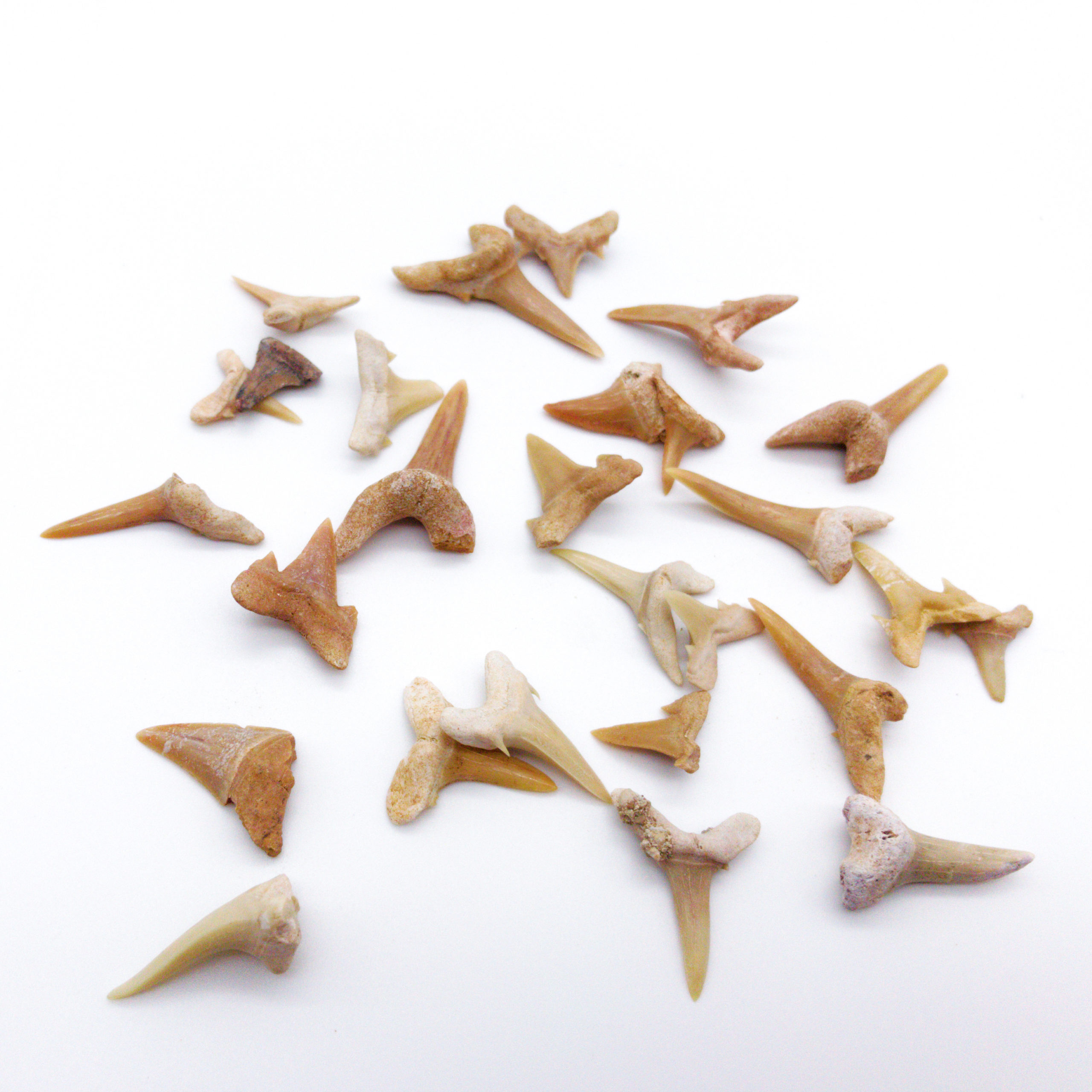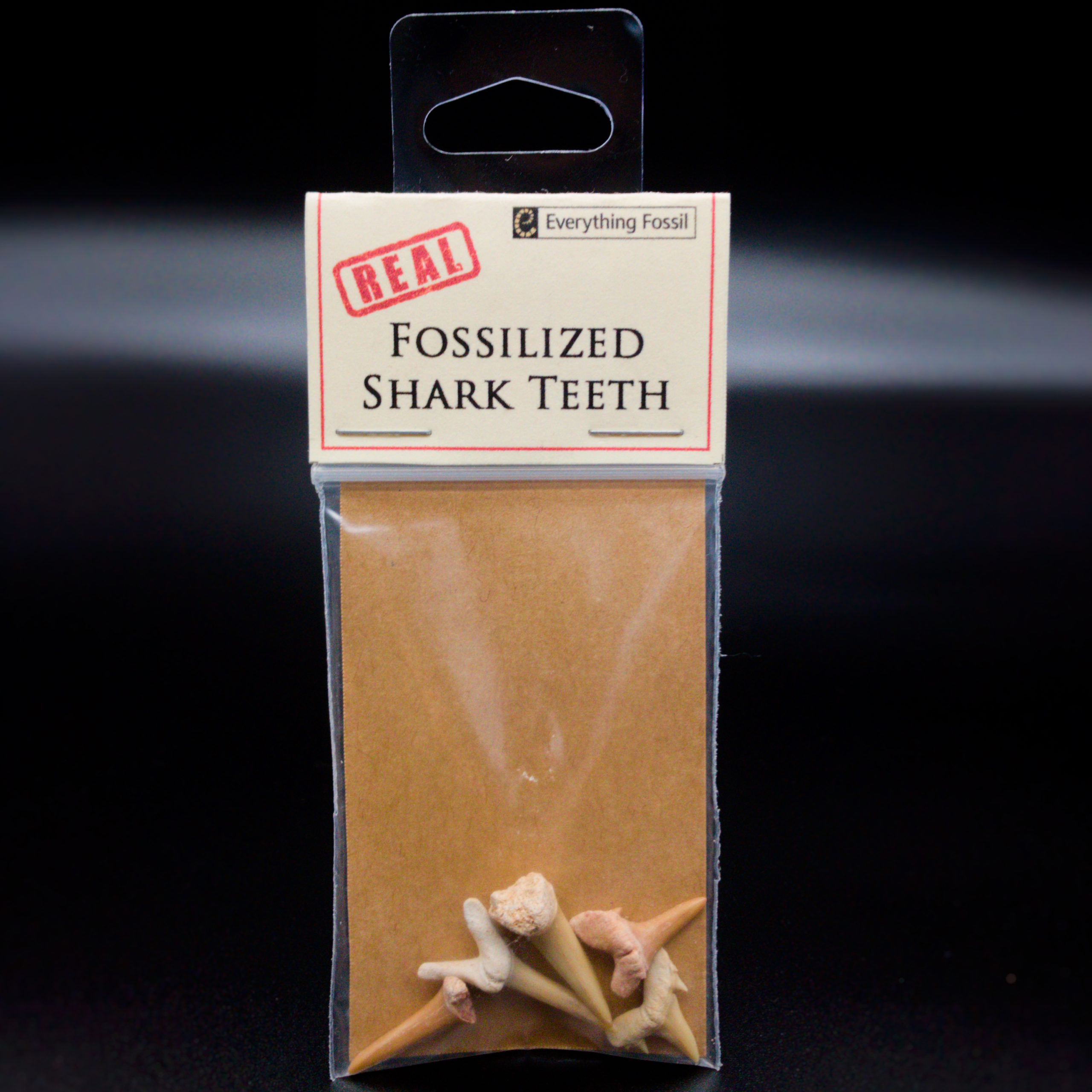 Shark skeletons are made primarily of cartilage and don’t usually fossilize. Their teeth are the most common remnant found. These teeth are approximately 1” long and come in a variety of sizes and types. Each bag includes 5 unique teeth.